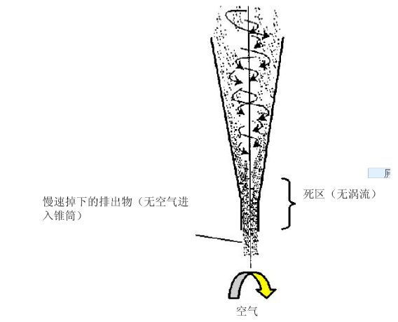 (1)工作原理:含有懸浮固相顆粒的鉆井液,在壓力作用下,以很高的速度由進液口進入圓柱蝸殼(旋流室內)。高速旋轉的鉆井液,繞錐筒中心旋轉產生極大的離心力,并向圓錐筒底部移動。由于鉆井液中的液體與固體存在著密度差,使固相分離出來面近靠錐壁。旋流器的錐筒越向底部半徑越小,鉆井液獲得的角速度越大,從而產生更大的離心力。鉆井液在錐體頂部不但繞中心高速旋轉,而且產生一個反向旋渦,經垂直導流管(中心管)而離開錐筒。鉆井液和鉆井液中的固相顆粒的運移速度幾乎相同,這些固相顆粒小半徑處,受到極大的徑向加速度。在徑向加速度(離心力)的作用下,迫使固相顆粒向錐筒壁運移。同時,由于旋轉下行的固相顆粒慣性很大,將推著它向底部快速運動,因此當液體反向旋轉,向上由溢流排除時,這些已分離出來的固相顆粒不可能隨溢流返回,而是由底流口(排砂口)排出。